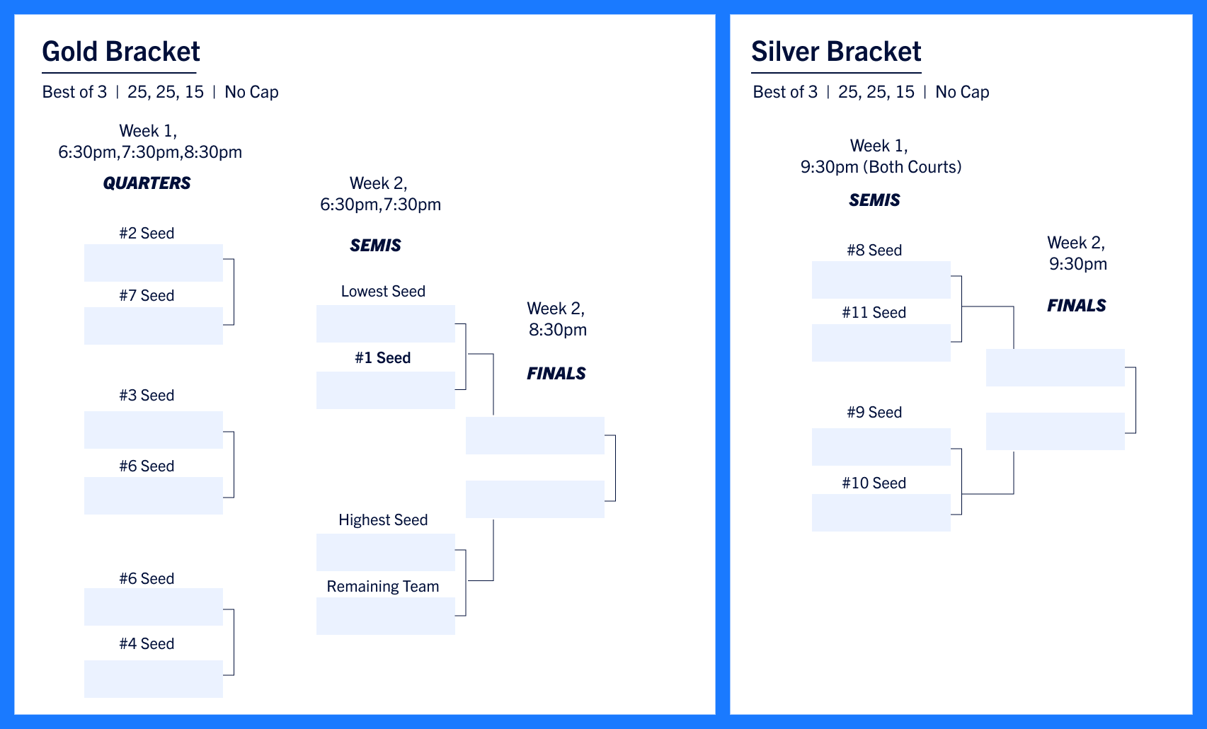 The current plan is to take the top 7 teams in Gold bracket, and Bottom 4 to Silver bracket. Tie breakers for seeding will be head-to-head > strength-of-schedule > Point diff